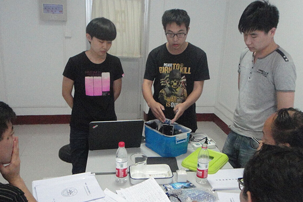 来自信息学院、控制学院、物理学院等的30余支参赛队带着自己的作品信心满满地前来进行作品调试和性能测试。A题要求小车从线路的指定点出发,沿轨道上铺设的“8”字形导航条走完全程。在行走过程中,利用光电技术测量,记录沿途所通过的三段隧道各自的长度及沿途路边树木的总棵数。B题要求利用光电法构建测量装置,非接触测量一个乳白色橡皮块制作的棱锥的体积。评委老师按照竞赛规则要求严格记录测试数据,仔细观察作品性能表现,并不时为表现优异的作品给予称赞。实物测试完毕后,工作人员进行分数统计,对前10名的作品进行设计方案答辩。答辩主要内容包括研究内容,研究方案,技术路线及可行性分析、特色与创新点、时间进度安排,经费预算、参赛队伍简介等。晚7时许,比赛落下帷幕。